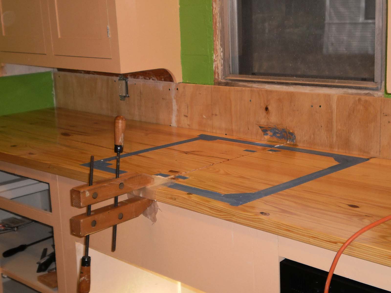 Here, we used the blue painter's tape to mark where the hole for the sink was to be cut. Rudy measured MANY times before cutting.