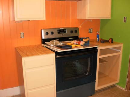 THEN, dry fitting the new smaller sized dishwasher (only 18" wide) in between the two cabinets. We bought the smaller size so that we wouldn't have to demolish the whole set of cabinets. Previously, the house had no dishwasher at all. It's much smaller than we're used to, but figured a smaller one was better than none, so we'll adjust. This dishwasher is also a few inches shorter than our old one and is ADA compliant, which might come in handy in the future, or for future residents.